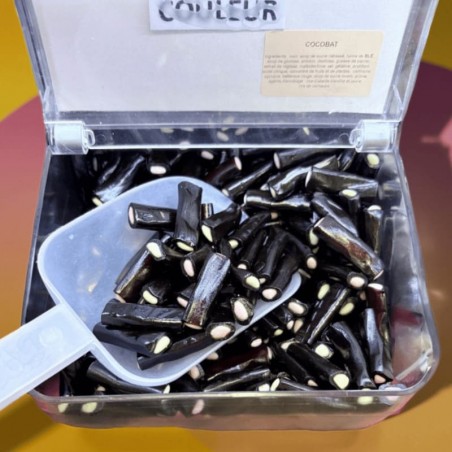 Le Cocobat réglisse est un bonbon en forme de petite barre au goût intense de réglisse.