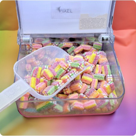 Les Bonbons Pixels Piks sont de petites confiseries carrées recouvertes d’une fine couche acidulée.